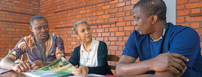 A equipa de coordenação da AEFJN-Camarões, conhecida localmente como Associação Fé e Justiça, é composta por cinco pessoas, dois religiosos e três leigos. Além da brasileira, a única não camaronense da equipa, o outro religioso é o padre Simon Valdez Ngah, pertencente à congregação dos Missionários dos Sagrados Corações e coordenador nacional da antena. Entre os leigos, conheço Joël Nomi, um jurista que desde pequeno se identificou com a bem-aventurança dos que têm sede de justiça e quis estudar Direito para seguir esta vocação.