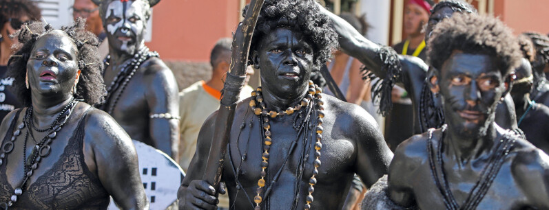 Entre as ruelas estreitas da cidade de Mindelo, ilha de São Vicente, Cabo Verde, o grupo Mandingas da Ribeira Bote finaliza a preparação do desfile que vai protagonizar, anunciando a folia. É assim desde o primeiro domingo do ano até ao que se segue ao Carnaval. São dezenas de homens e mulheres com o corpo seminu, em que espalharam carvão misturado com óleo, dando à pele um tom negro uniforme e brilhante. Estão vestidos com saiotes de sisal ou corda. Aprimoram a pintura, reforçando o negro, e ultimam os adereços