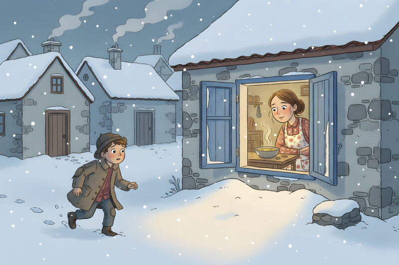 Numa noite especialmente gelada, Helena ouviu passos apressados. Era um rapaz desconhecido, com o casaco rasgado e os olhos cheios de medo.
