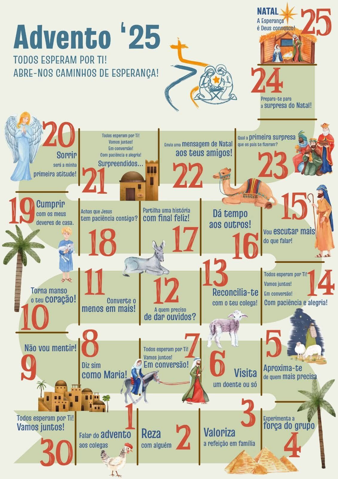 Calendário de Advento, que sugere ao longo deste tempo, atividades que podes realizar para fortalecer a confiança em Deus e o serviço aos irmãos e irmãs.