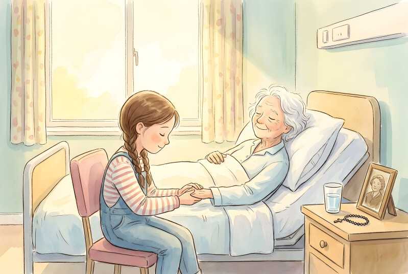 A certa altura, a avó pediu: — “Rezas comigo?” Rezaram juntas, de mãos dadas.