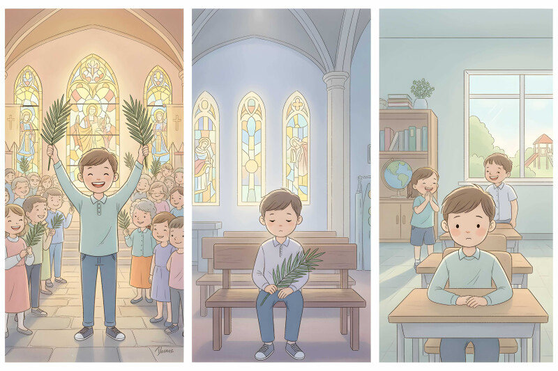 No Domingo de Ramos, entrou na igreja entusiasmado. Ramos no ar, alegria, festa. Mas