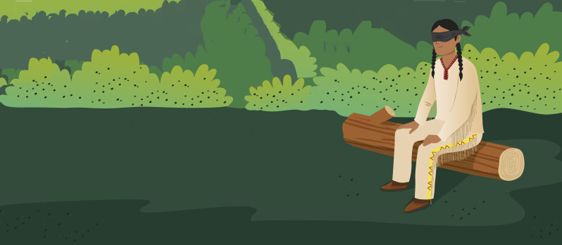 Narrador: O vento sopra forte a noite toda, balançando as árvores, mas o rapaz continua corajosamente, sem tirar a venda dos olhos.