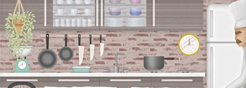 Cozinheiro: Tiro do frigorífico o que preciso e ponho na mesa. Peso as doses com a balança. Guardo o que não preciso no taparuere. Com esta faca, corto e divido as porções. Preciso de uma panela… Cá está! E, agora, é só esperar sentado que o fogão cozinhe.