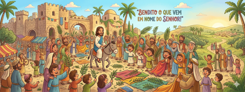 Imagina uma cidade cheia de gente, com ruas estreitas e casas de pedra. De repente, todos começam a correr para ver alguém muito importante. É Jesus, que chega montado… não num cavalo forte e veloz, mas num jumentinho simples e humilde.